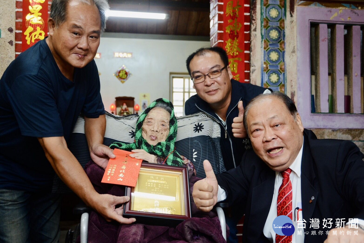 今年甫滿百歲的盧黃金角女士育有2子3女,目前由兒子盧能景貼身照顧逾13年,每天精心準備蔬菜粥及營養補給品,生活起居無微不至。阿嬤精神奕奕,沒有牙齒的她現場哼唱著耳熟能詳的台語老歌「農村曲」,怡然自得的可愛模樣,讓現場氣氛極為歡樂融洽。