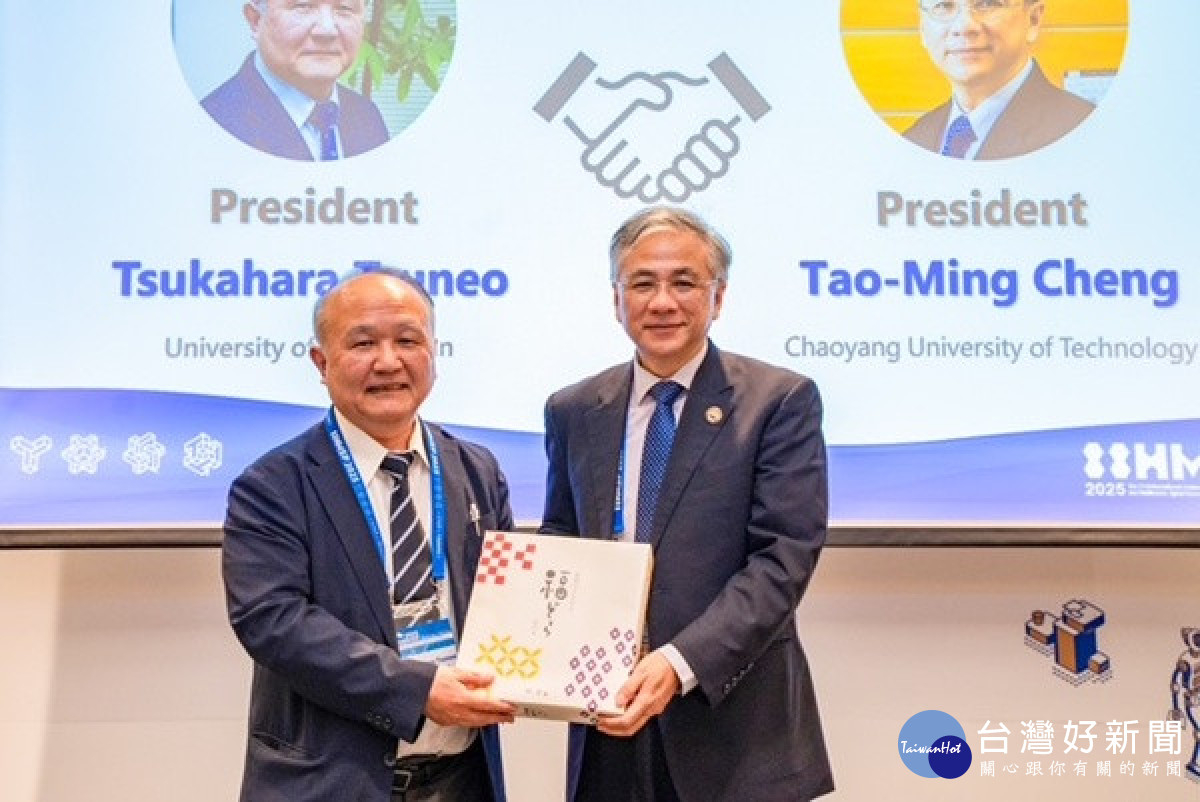 朝陽科大校長鄭道明(右)特別感謝日本姊妹校會津大學校長Tsukahara Tsuneo(左)大力支持,兩校共同培育資訊人才成果豐碩。林重鎣