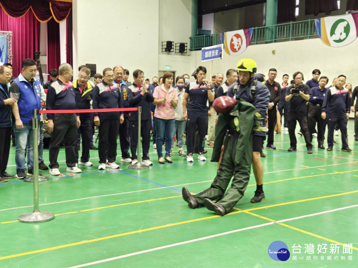 59名義消選手齊聚一堂,分別參加火災搶救、救護技術、車禍救援、無人機運用及繩索救援等5大項目,展現新北義消的團結與活力。中國探針、南亞塑膠等企業義消的加入,不僅擴展民間力量,更提升整體防救災的韌性與應變能力