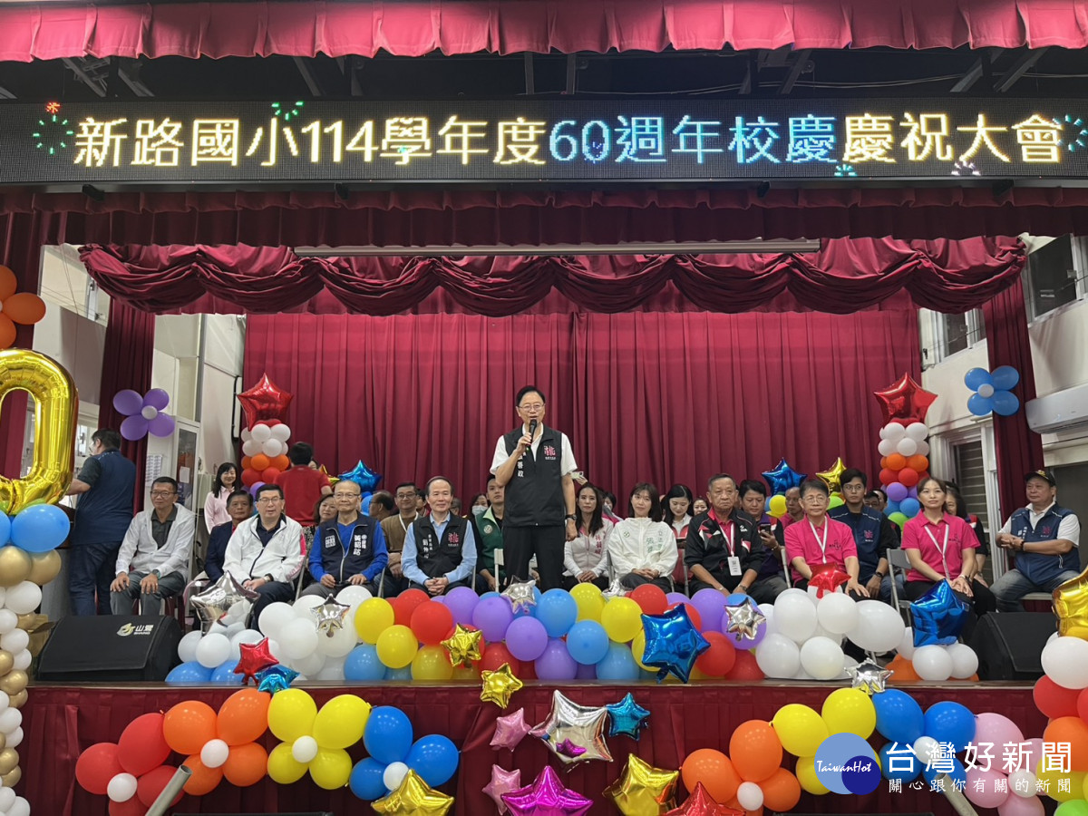 桃園市長張善政今(24)日上午至龜山區新路國小,出席學校創校60週年校慶,為學校祝賀,並偕同立委、議員及各界貴賓與新路國小親師生齊聚一堂,共同見證這所深耕在地、陪伴社區成60年的教育里程碑。典禮於上午在校園隆重登場,學校安排鼓隊迎賓、龍獅獻瑞賀壽辰等精彩節目,展現新路國小學生多元的才藝與活潑的校風。
