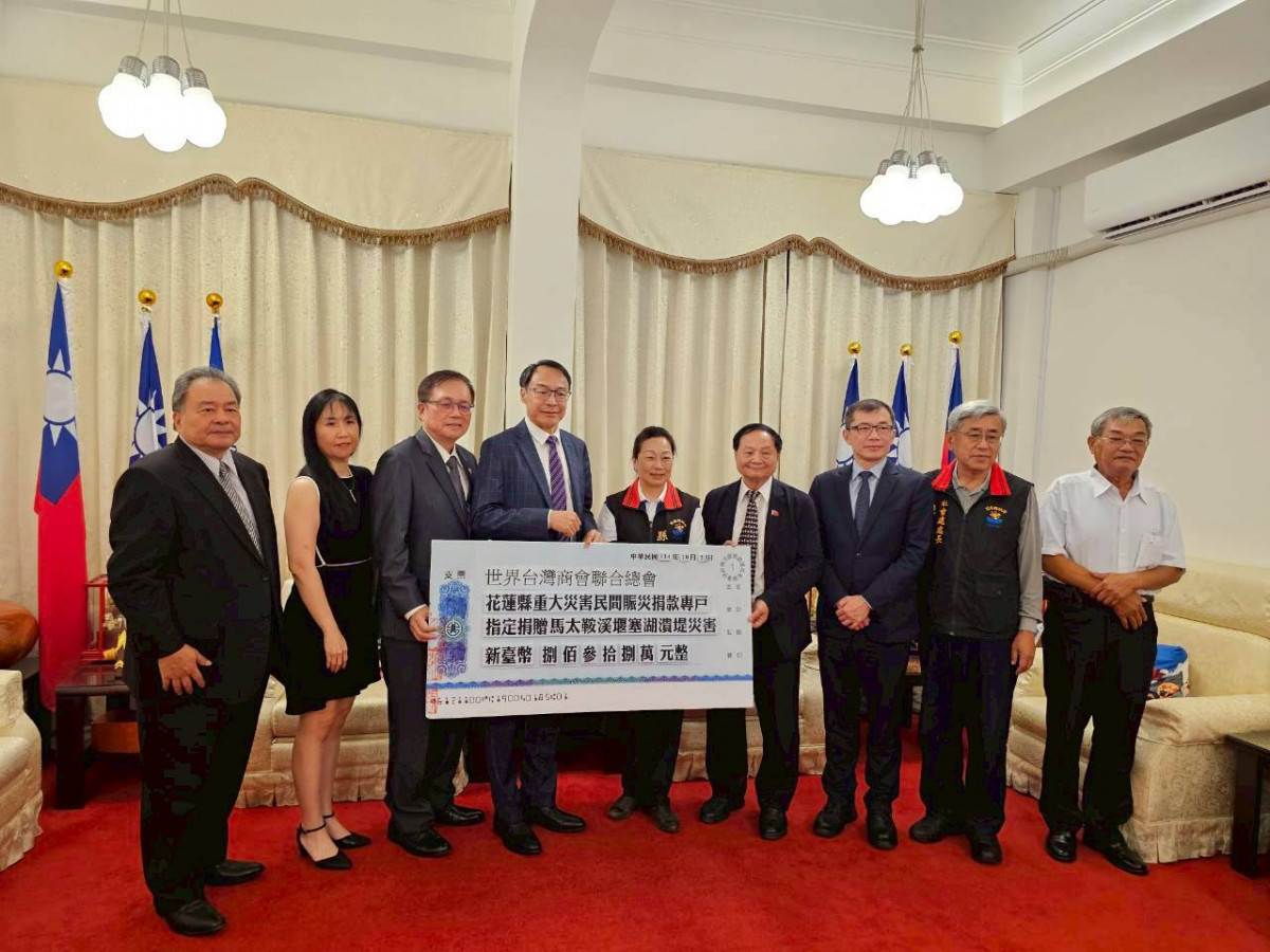 世界台灣商會聯合總會(下稱「世總」)再次展現全球台商的愛心與力量,為協助日前花蓮縣馬太鞍溪潰堤的受災戶度過難關、重建家園,特地發起募款,共募得逾新台幣838萬餘元善款,並於10月23日捐贈予花蓮縣政府,指定專款專用於受災戶的生活慰助及災後重建事宜。