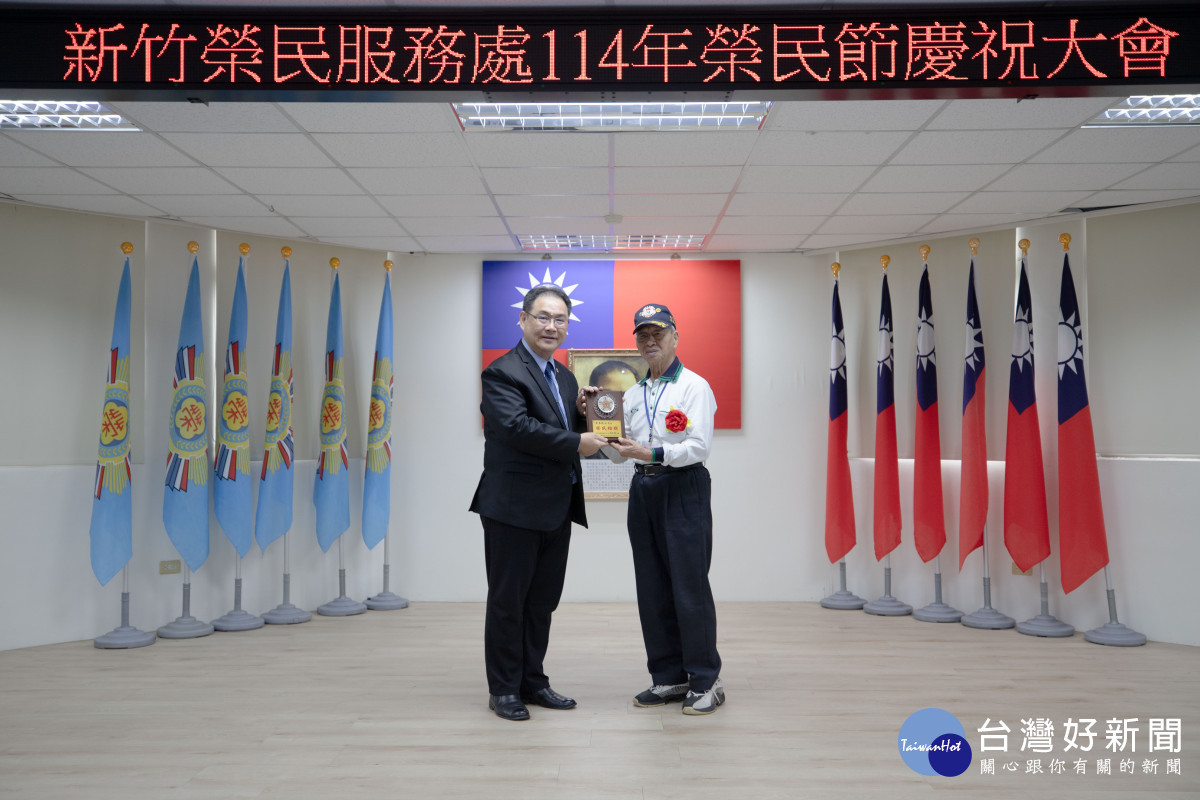 鞠宗顯處長頒贈八二三抗戰英雄呂木廷榮民楷模獎牌,表揚榮民犧牲奉獻精神。