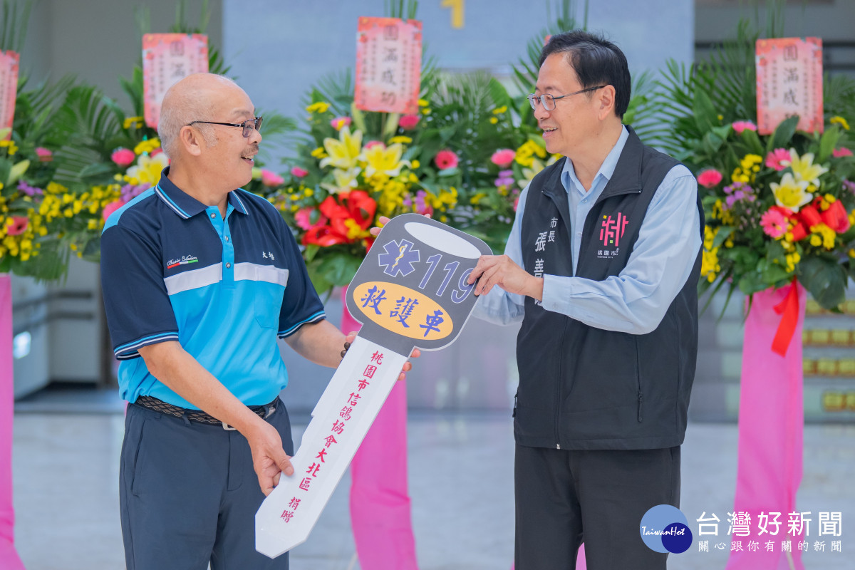 桃園市長張善政30日前往桃園區,出席「桃園市信鴿協會大北區分會捐贈本府消防局救護車典禮」。張市長感謝桃園市信鴿協會大北區分會長期關注公共安全與急難救護,並談到,該分會自109年以來已兩度捐贈救護車予市府消防局,展現企業與民間團體回饋社會的公益精神。此次捐贈的救護車將配置於復興區巴陵地區,為山區居民與前來旅遊的遊客提供更即時、安全的緊急醫療服務。