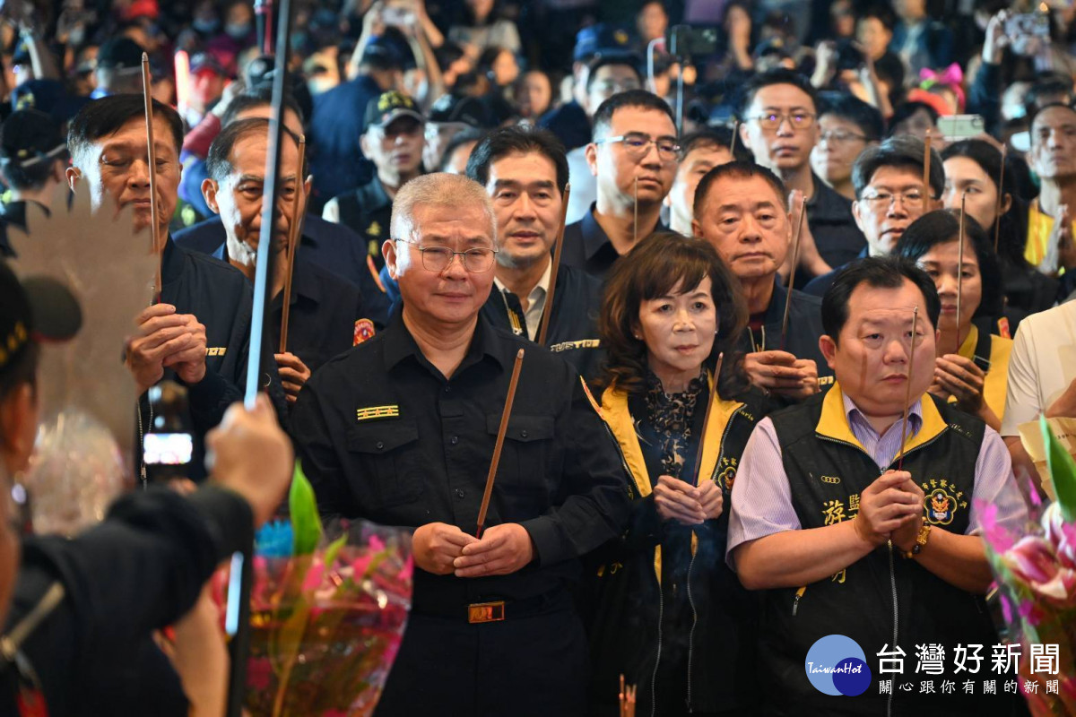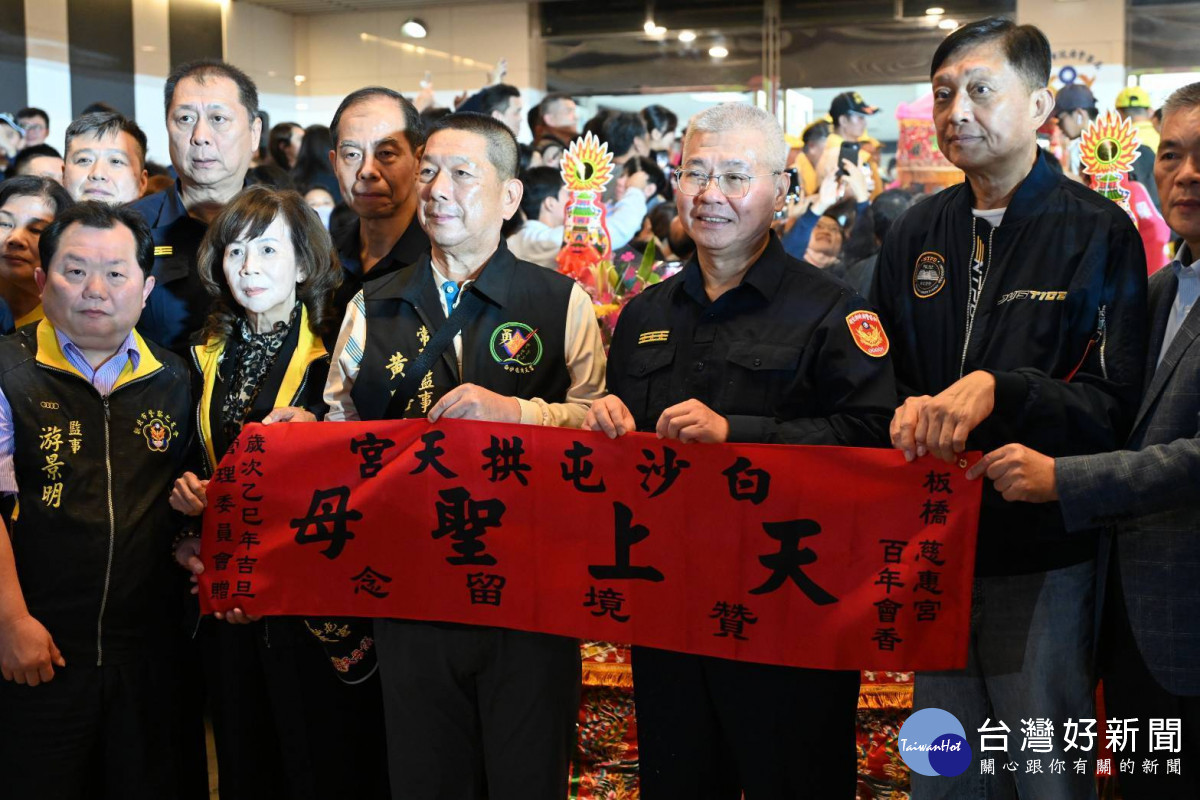 有「粉紅超跑」美譽的苗栗通霄白沙屯拱天宮媽祖,1日下午5時33分停駕新北市政府警察局。大批信眾齊聲高喊「進喔!」,氣氛熱烈。媽祖神轎短暫停駕警局,由局長方仰寧率領同仁恭敬參拜,祈求新北治安平穩、交通順暢、民眾安居樂業。
