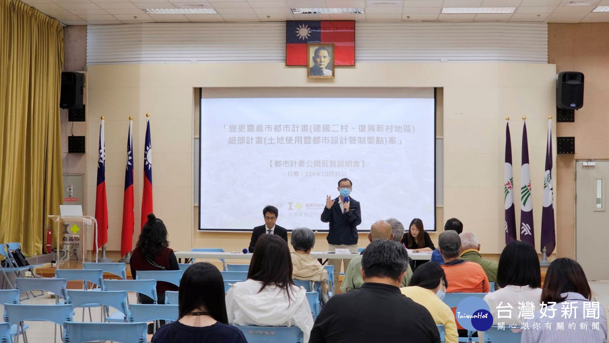 嘉義市政府10月31日舉行「變更嘉義市都市計畫(建國二村、復興新村地區)細部計畫(土地使用暨都市設計管制要點)」案公開展覽說明會,邀請本計畫範圍內土地所有權人國防部、財政部國有財產署及私有土地所有權人共同參與,說明三軸三心構想及「東門町人本綠都心」定位等都市計畫變更內容。