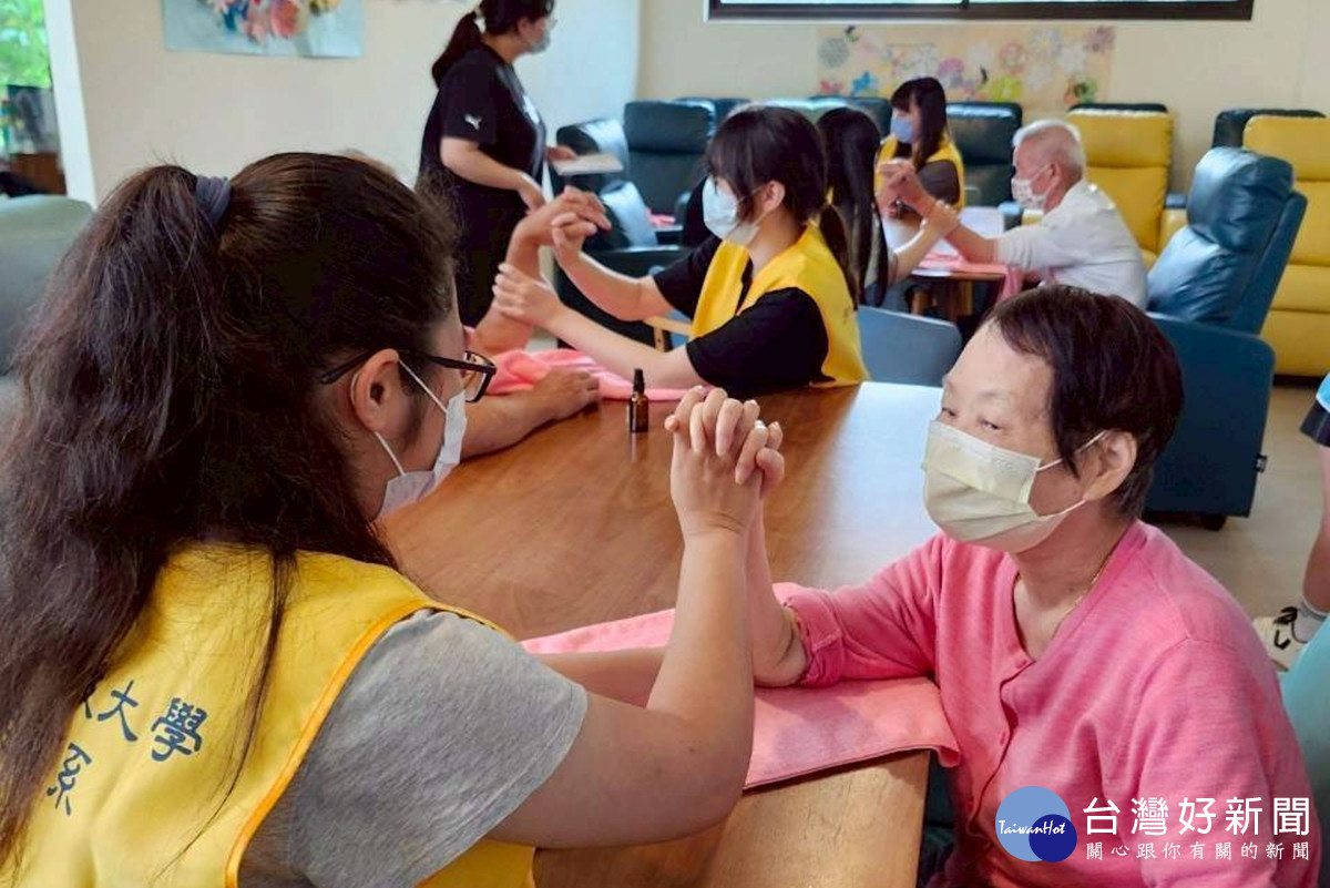 老福系學生為長照機構長者進行精油按摩。(弘光科大提供)
