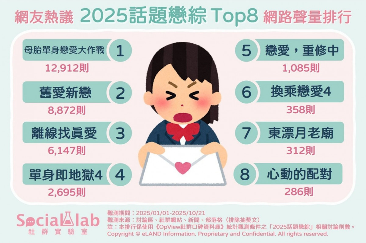 戀愛綜藝(戀綜)以其充滿戲劇張力的情感拉扯,持續吸引觀眾目光。《Social Lab社群實驗室》透過《OpView社群口碑資料庫》追蹤2025年「戀愛綜藝」相關話題的網路聲量,盤點出年度討論度最高的八部作品。