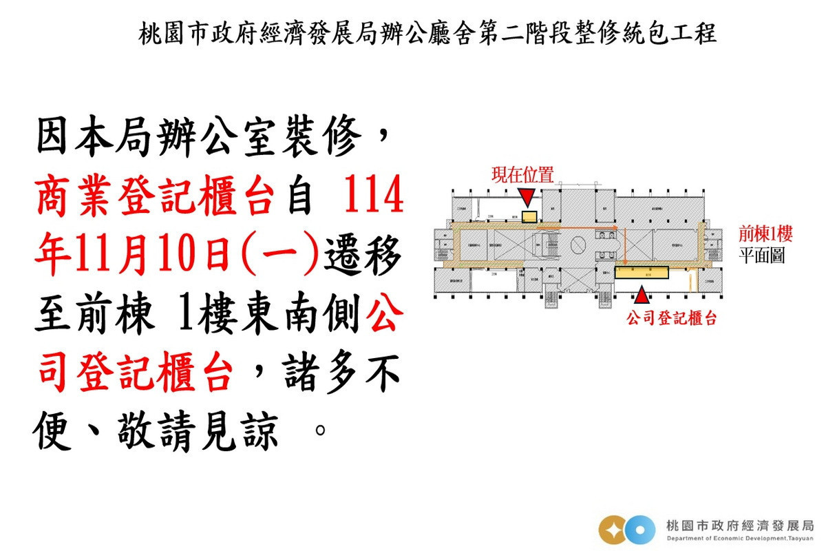 桃園市政府經濟發展局10日表示,為提供洽公民眾更優質的辦公場域環境,原位於市府大樓1樓的工廠登記及商業登記櫃檯,自114年11月10日起辦理裝修封閉,辦公室裝修作業預計於115年3月底前完成。