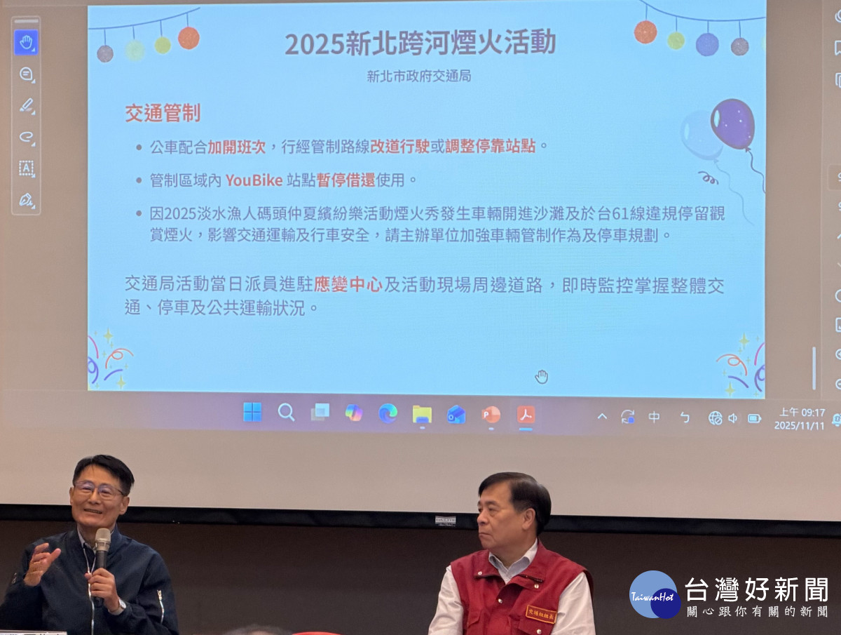 另淡水、八里跨河煙火活動將於年底登場,陳純敬表示,主辦單位文化局已提出人車分流及接駁車、大眾運輸規劃等交通維持計畫,為避免民眾駕車駛入沙灘管制區或於台61線違停觀賞煙火,屆時警察局將加強車輛管制及違規取締。交通局再次呼籲民眾務必遵守相關指引及管制措施,並多利用台鐵、捷運、公車等大眾運輸交通工具,避免塞車及尋找車位的困擾。