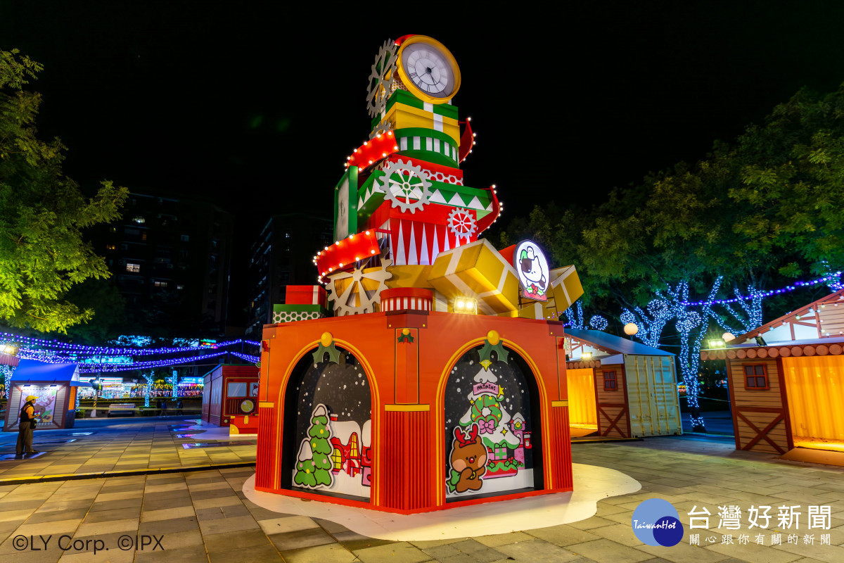 站前廣場今年則打造成「歐洲夢幻童話村」,讓人彷彿走進童話繪本實境,復古歐風小屋在燈光映照下閃耀光彩,街道間瀰漫著浪漫夢幻的氛圍。其中,由禮物盒與緞帶交織而成的「魔幻時鐘塔」矗立在中間,成為最吸睛的焦點裝置。隨著時間流轉,神祕禮物盒會驚喜開啟,LINE FRIENDS minini角色萌趣現身,伴隨漫天飛舞的雪花飄落,讓人盡情沉浸於雪國童話的迷人世界中。