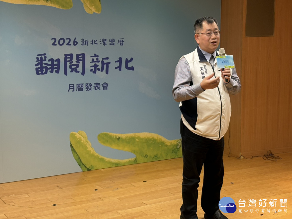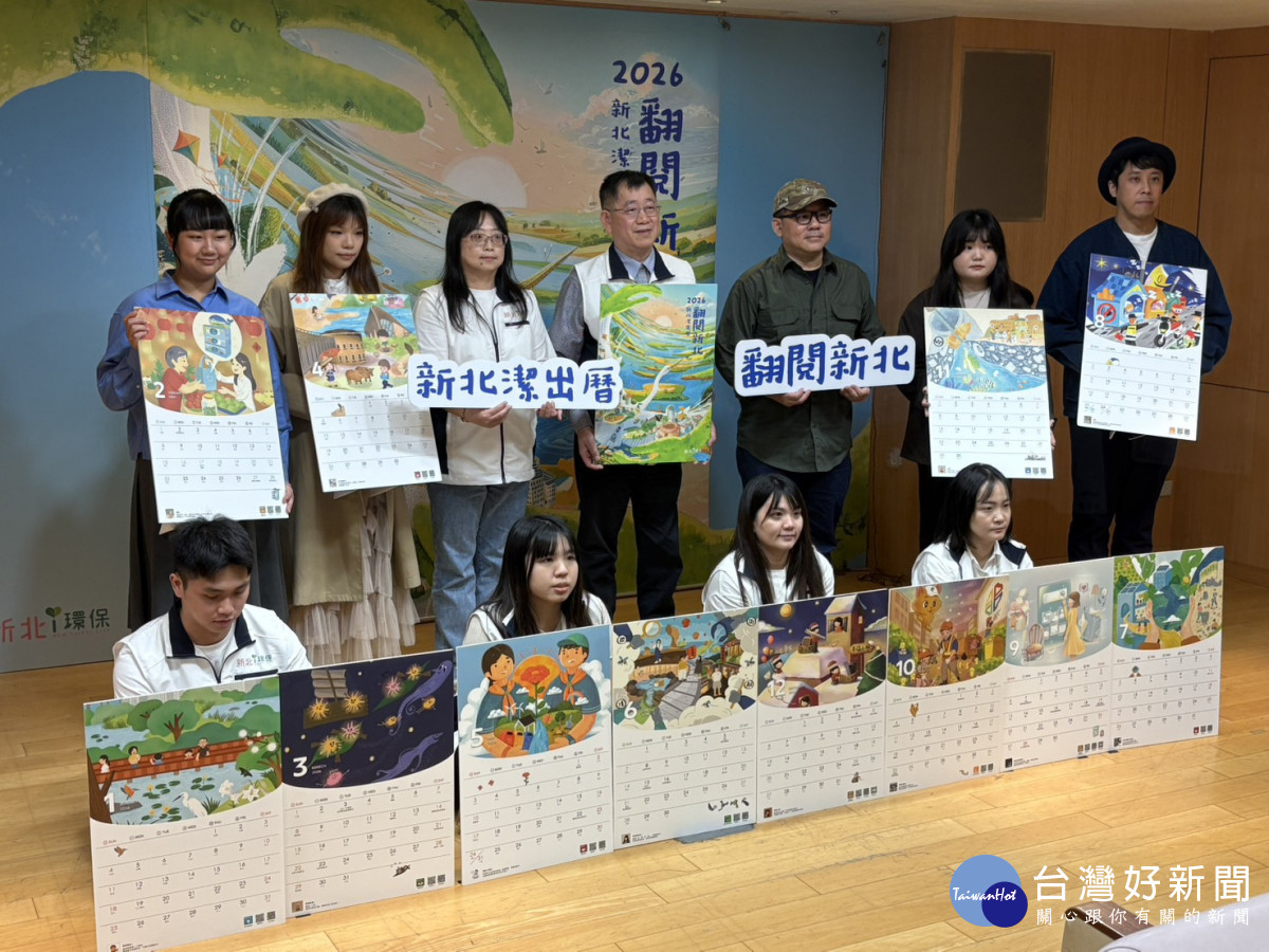 新北市環保局自2021年起製作環保月曆,逐步建立屬於新北的城市特色與永續形象。2026年全新月曆《新北潔出曆》今(14)日正式發布,環保局副局長朱益君與創作插畫家及配樂製作師溫子捷老師共同揭曉完整月曆作品。全新主題「翻閱新北」象徵如同翻閱月曆般,每一天都是新的開始,同時展現新北不斷轉變、翻越舊貌的嶄新風貌。當天特別邀請4位插畫家親自分享創作理念,讓現場民眾更深入理解作品背後環保故事,感受新北城市在永續與美學之間的精彩連結。