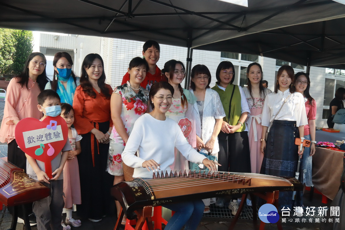 許淑華到各攤位體驗,彈起古箏甚覺有趣。(記者扶小萍攝)