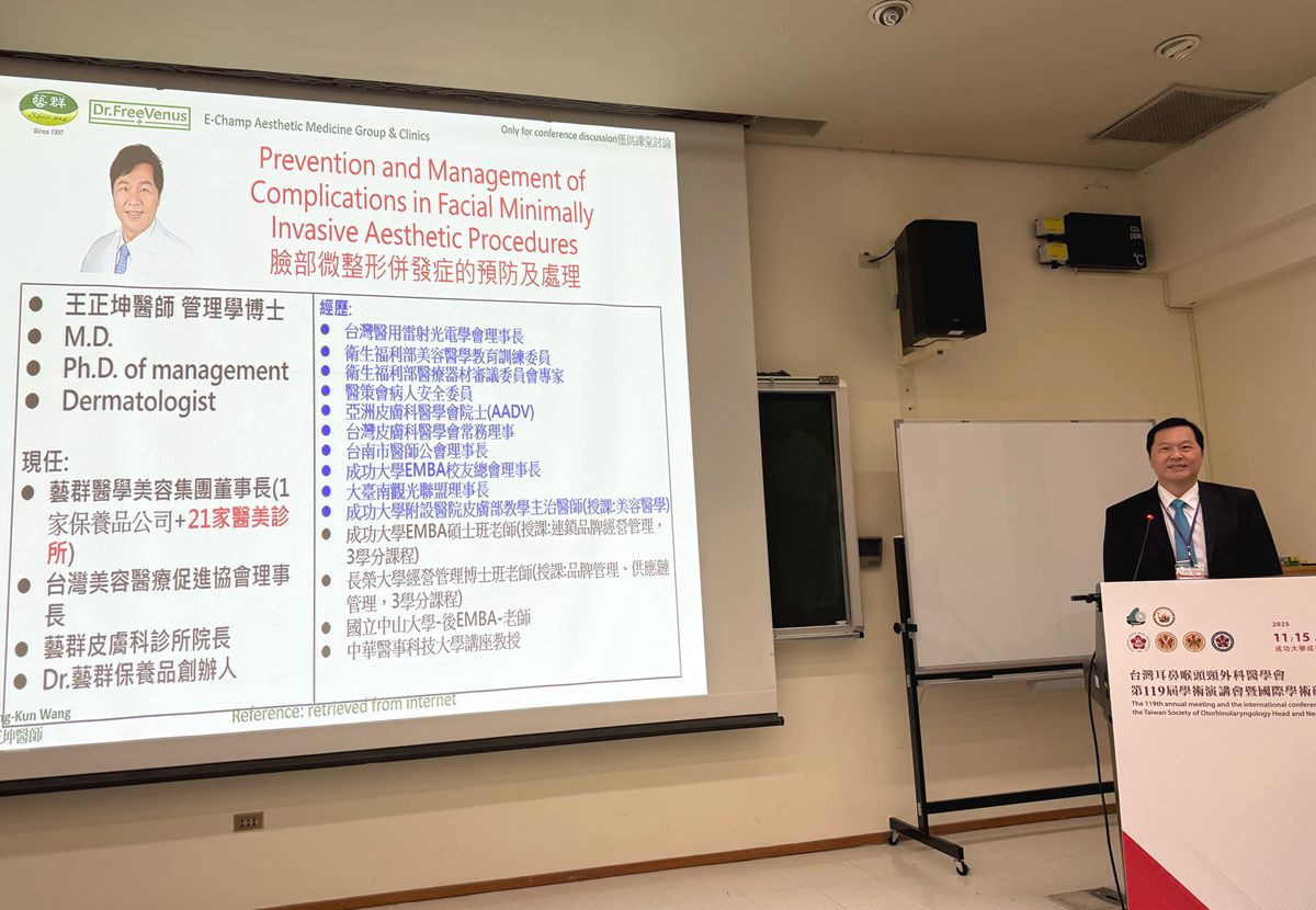 台灣耳鼻喉頭頸外科醫學會在成功大學醫學院舉辦第119屆學術研討會,邀請台灣美容醫療促進協會理事長王正坤醫師於11月16日,發表「臉部微整形併發症的預防及處理」專題講座,分享最新國際安全趨勢與臨床防治經驗,並由涂智文醫師與羅盛典醫師擔任座長主持會議。