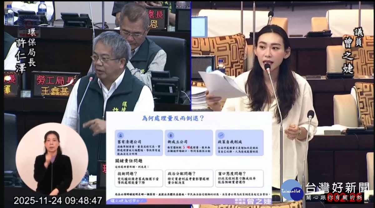 曾之婕指出,台南市處理量能呈現「倒退」現象,主要癥結點包括:一、審查流程與限制過於僵化,既有的清運公司面臨進場重量限制、審查流程冗長,導致實際處理量被大幅壓縮,使產能無法充分利用。二、新設公司量能不足:新成立的公司每家僅被分配到5噸的處理量,形同「象徵性的分配」,根本無力協助填補每日450 噸的巨大缺口。三、政策自縛手腳:儘管環保法規眾多,但市政府的相關政策非但未能增加處理量,反而自我設限,造成量能倒退。