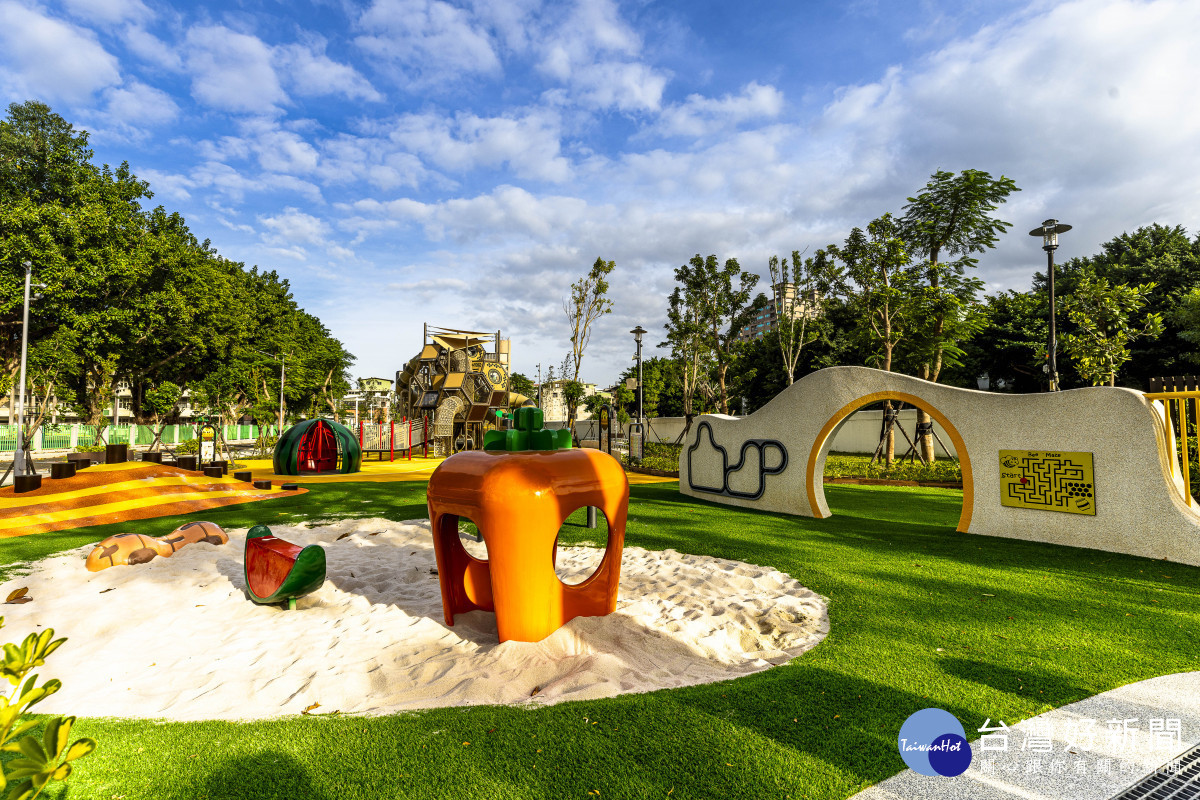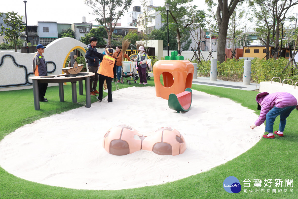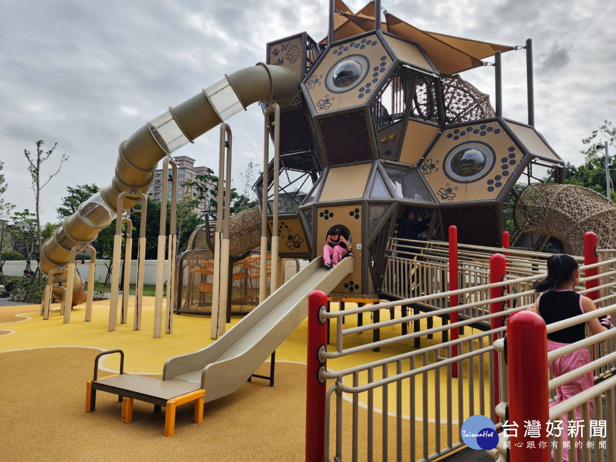 馮兆麟說明,最吸睛的亮點為蜂巢主題遊戲塔,靈感源自蜜蜂飛行路徑,設計富有挑戰性的滑梯與攀爬設施,鼓勵孩童探索冒險;共樂地景沙坑區提供西瓜轉盤、沙坑及益智遊戲牆,促進孩童感官發展與社交互動。健康樂活區設置共融體健器材,長者及身障者亦可安全使用;共享廣場可舉辦各類活動,促進社區交流。園內同步建置人本友善步道,完善無障礙通行動線,讓長者、孩童及行動不便者皆能安心往來。