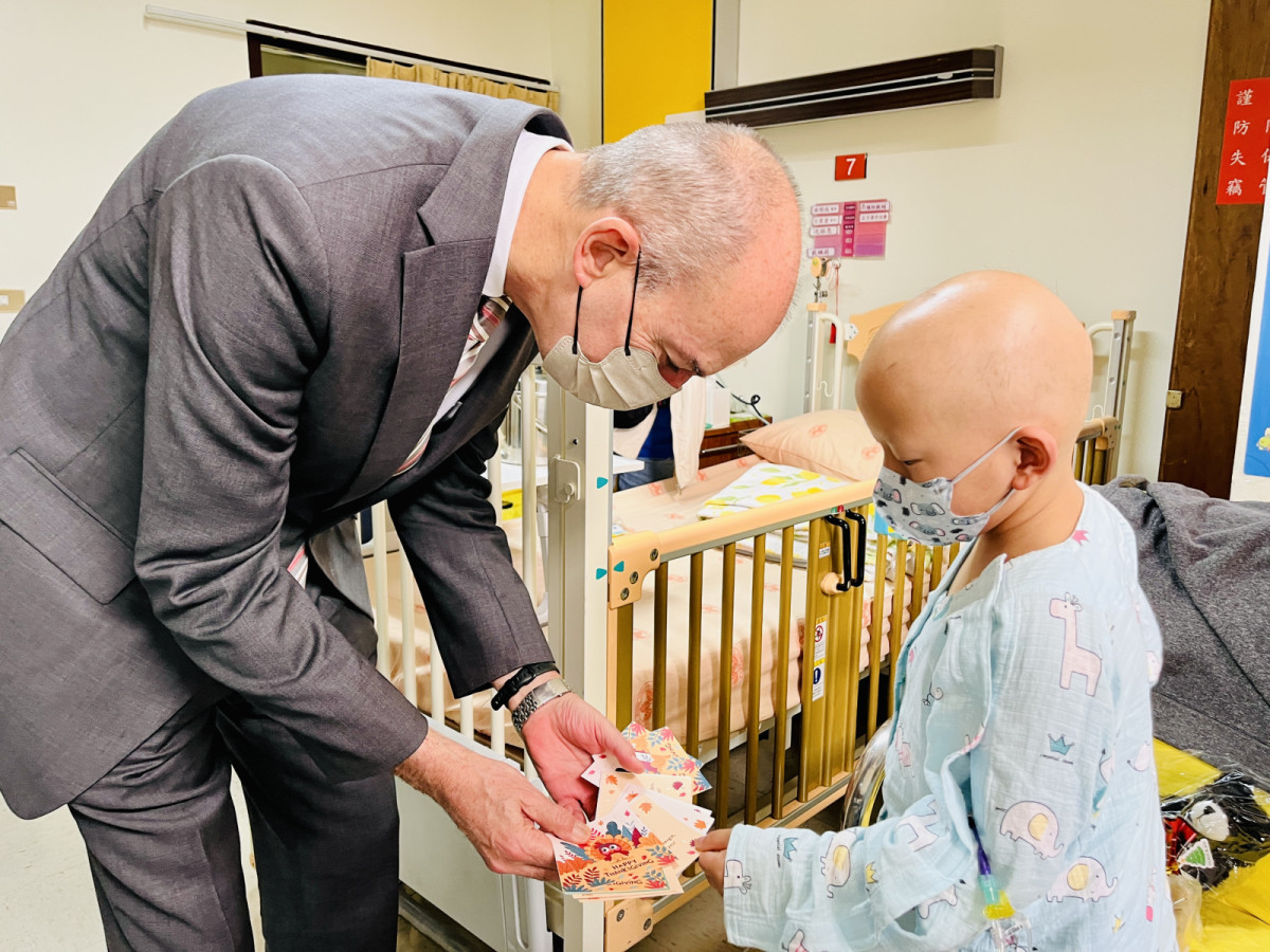 隨後,瑞澤宇與徐祥珍一行人在醫護陪同下至病床前探視病童,看著孩子小小身軀插著點滴,仍露出靦腆微笑,讓飯店團隊心疼不已。他們親切地將手工烘焙的「健康麵包與活力餅乾」、超人氣「香格里拉小黑熊」以及「感恩節加油打氣小卡」送到孩子手中。對經歷艱辛療程的小鬥士而言,小黑熊不僅是禮物,更是克服恐懼的「勇氣夥伴」。透過大家的暖心鼓勵:「你們並不孤單!」讓病房洋溢久違的溫馨與笑語。