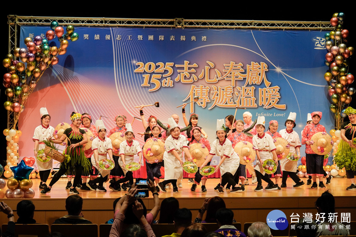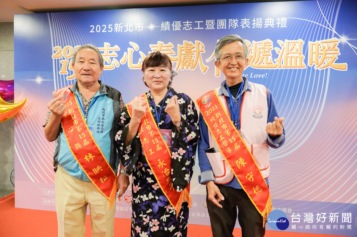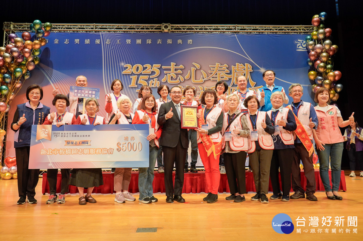 新北市政府社會局今(2)日於3樓多功能集會廳表揚第15屆金志獎,共有8個志工團隊、50位志工、56位耆心獎(高齡志工)及5位志工督導獲獎。侯友宜市長表示,志工是守候新北市這座404萬人口城市最溫暖的力量,讓社會更祥和。並鼓勵男性多走來參與志願服務,身體會更健康、更長壽,以免老待在家裡變成「老孤孓」。