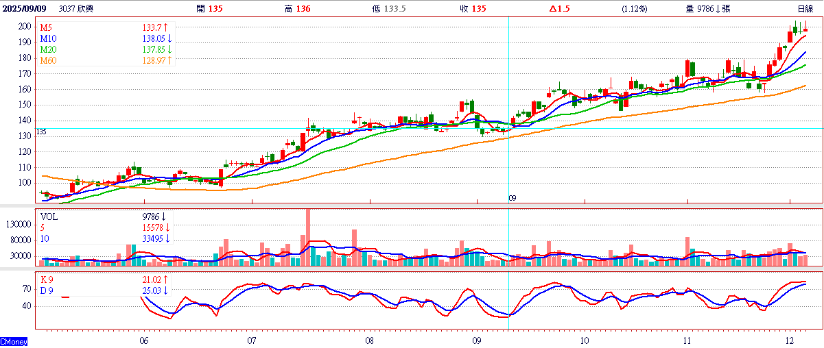 台股5日走勢呈現平盤上下波浪狀震盪起伏,加權指數終場上漲185.19點,收在最高,收盤時整體盤面表現,漲幅前三大類股依序為玻璃、居家生活及電腦周邊,而盤面上PCB族群中的ABF高階載板三雄表現最為亮眼,其中欣興(3037)更在外資看好缺料問題明年有解,並上調目標價的帶動,股價開盤買盤持續湧進,推升股價震盪走高,並於午盤後攻上218元漲停、上漲19.5元,隨後拉回亦保持在高檔區間震盪整理,直至收盤股價上漲16.5元、收在215元,再創2年又8個月來新高。