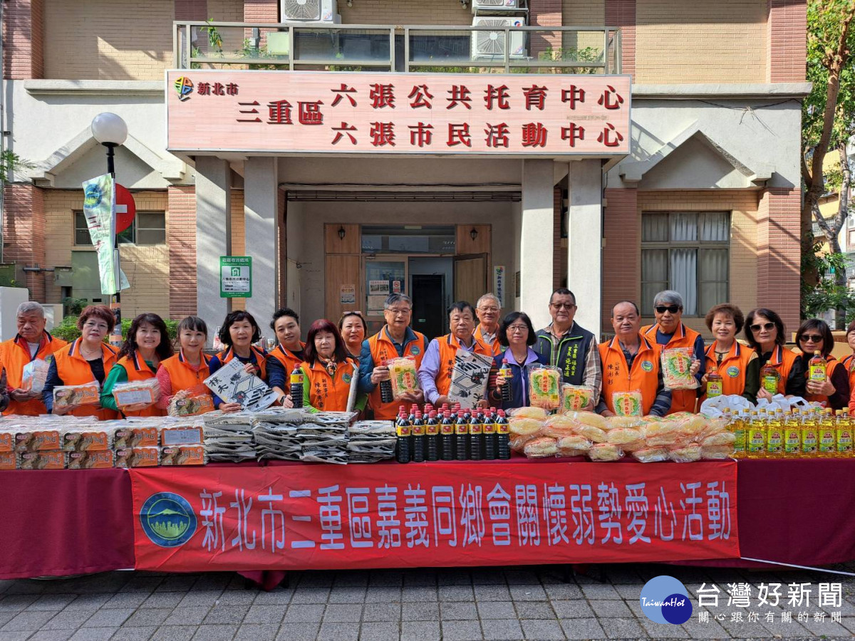 三重區嘉義同鄉會響應新北市好日子愛心大平台,今(6)日於三重區六張公園發放愛心物資,每份物資包含白米、蔬菜油、醬油、拉麵等市值600元。除六張公園外,另兩場將在三重區過圳市民活動中心及蘆洲區忠義廟公園,每場各發放300份等三場共900份總計54萬元。同鄉會理事長蔡祐銓說,歲末天寒考量一些弱勢家庭的生活辛苦,因此連續第6年舉辦愛心物資捐贈,希望受贈戶也能感受社會的溫暖。