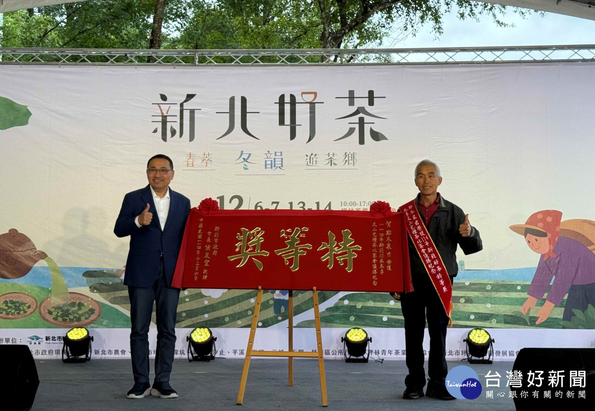 新北市長侯友宜今(6)日出席冬季包種茶比賽頒獎典禮,頒發5屆冠軍茶王鄭冬泉特等獎匾額,並表揚新北茶農持續傳承優良製茶技術,讓新北特色茶風味取得各界肯定。新北好茶冬韻展售會於12月6、7、13、14日在坪林茶業博物館旁廣場持續進行,民眾要把握機會,親自品嚐「百萬冠軍茶」新北包種茶的清新花香。