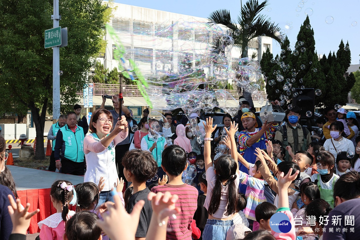 上午的活動,安排魔術秀、泡泡秀還有氣墊遊樂設施,大小朋友宛如置身遊樂園。黃秀芳則由立委陳秀寳等人陪同,一起和親子在馬路塗鴉,有孩子畫出卡通人物,也有人寫下「我愛臺灣」,還有親子創作「八卦山大佛」,馬路宛如一塊大型畫布。