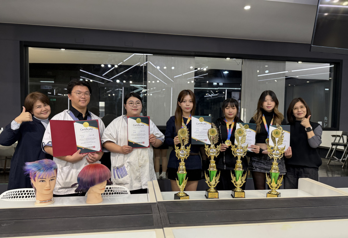 妝品系助理教授劉美鈴、美髮系助理教授黃翠如日前赴韓國參加「第二十屆K-BEAUTY 國際美容技能比賽」,分別獲得職業組創意彩妝設計、創意染髮設計組大獎(也稱為大賞),兩人也把5名學生精心設計製作的作品,帶去參加靜態組比賽。妝品系大三學生黃雅柔、陳萱、林宇少,分別在學生組時尚彩妝設計、新娘彩妝設計、睫毛設計奪得金獎;美髮系大二學生涂巧芸、沈文凱,也分別在創意染髮設計、時尚創意剪髮拿到金獎。