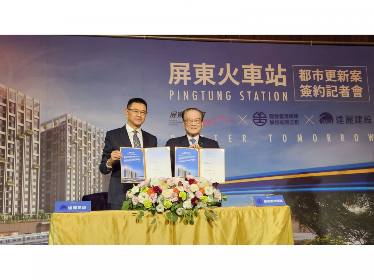 【理財周刊記者顏瓊真報導】「屏東火車站東側土地公辦都市更新案」,臺鐵公司董事長鄭光遠(主照圖右)與取得最優投資人的達麗建設董事長謝志長(主照圖左),10日在內政部次長董建宏、屏東縣副縣長黃國榮的共同見證下,舉辦簽約儀式,未來將興建1幢3棟地上20層、地下4層的住商大樓。