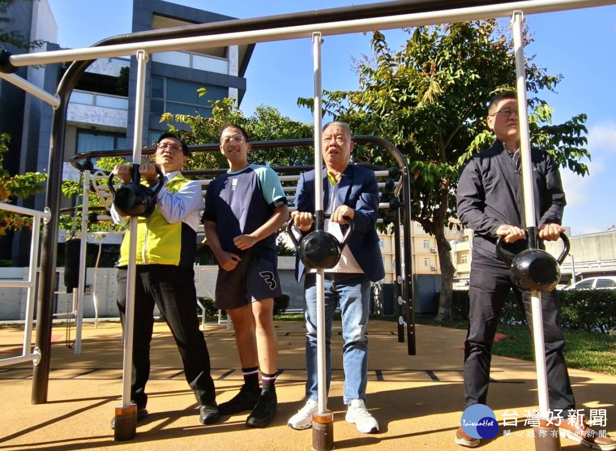 林世賢市長和縣議會副議長許原龍以及市民代表會主席陳文賓在公園新增的戶外健身區示。圖/記者鄧富珍攝