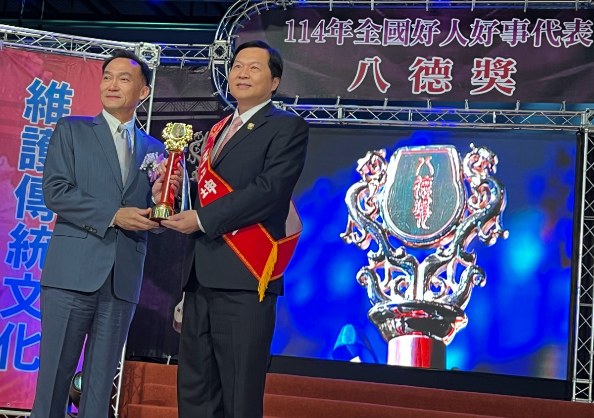 中華民國表揚好人好事運動協會主辦的114年全國好人好事代表「八德獎」頒獎典禮,12月10日在臺北市政府青年局舉行。王正坤醫師以長年深耕醫療公益、扶助弱勢及回饋教育的卓越事蹟,榮獲「八德獎」殊榮,成為全國醫界與企業界兼具的典範代表。