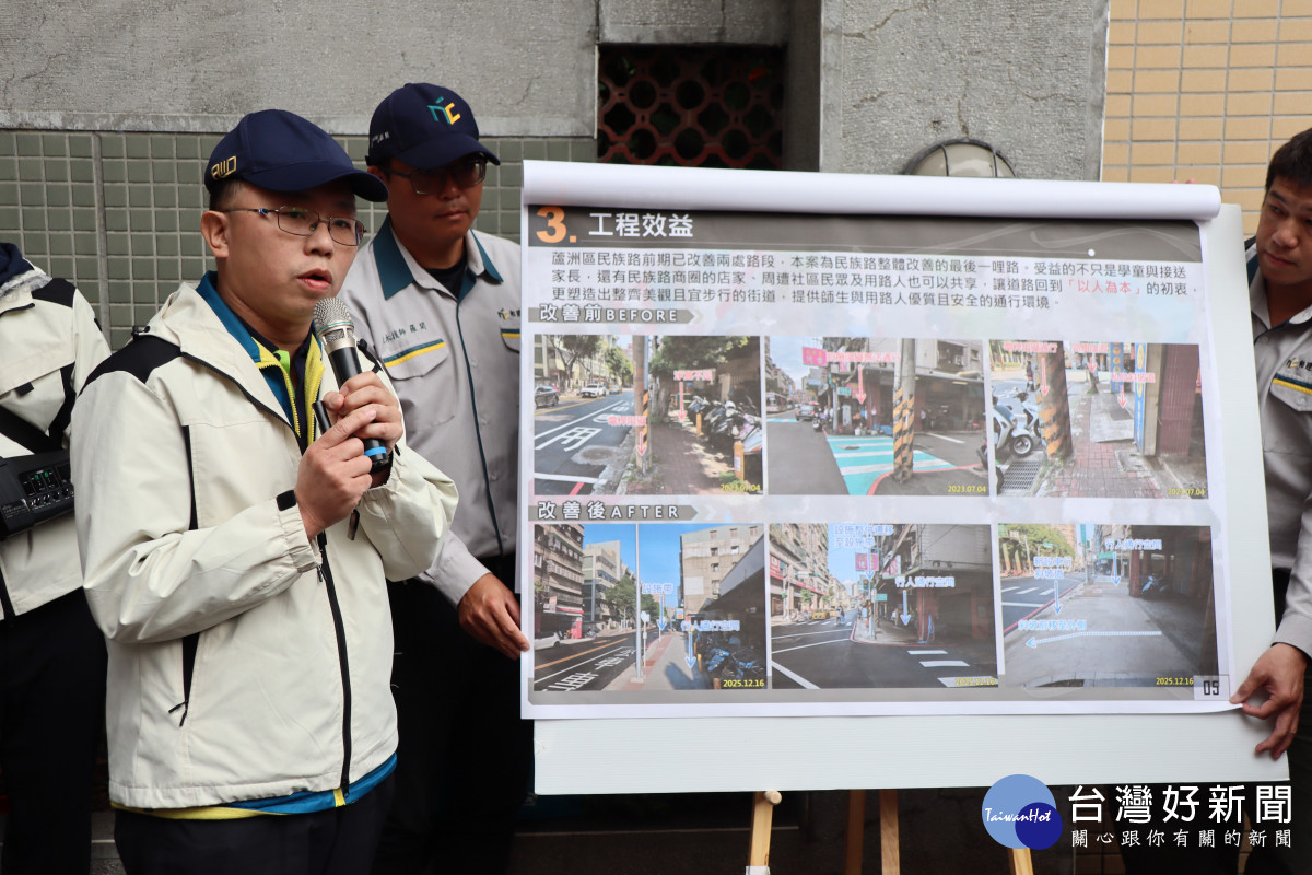 馮兆麟說,民族路是蘆洲區主要道路之一,周邊住宅、商家與學校密集,行人通行需求高,因電桿、植栽及私人建物占用,導致人行道淨寬不足1.5公尺,市府三階段推動改善,第一、二期工程已陸續完成。第三期工程經費為3,756萬8000元,經與居民、店家協調,遷移設施及拆除占用物,完工後人行道寬度達1.5公尺以上,改善長度約810公尺。
