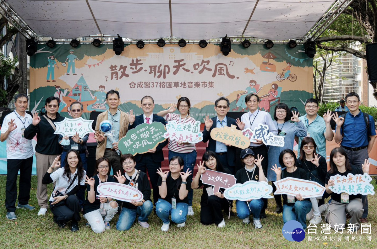 成大醫院20日下午,在成功大學榕園再度舉辦「散步.聊天.吹風 成醫37榕園草地音樂市集」活動。在冬日暖陽下,以溫暖、放鬆的氛圍邀請同仁與親友度過療癒午後。今年同樣匯集多達百攤市集與多組精彩演出,包括知名藝人卡司與成大醫院「創藝達人」同仁表演,展現醫院豐富多元的人文能量及文化素養。成大醫院也藉此活動,向辛勤付出的同仁獻上最真摯的感謝。