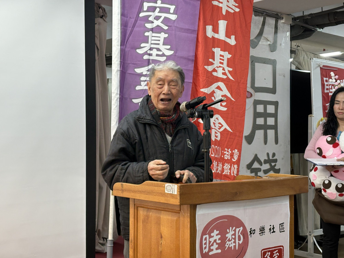 在充滿節慶氣氛的士林平安站,高齡百歲的曹慶先生拄著拐杖現身,展現對弱勢服務的終身承諾。