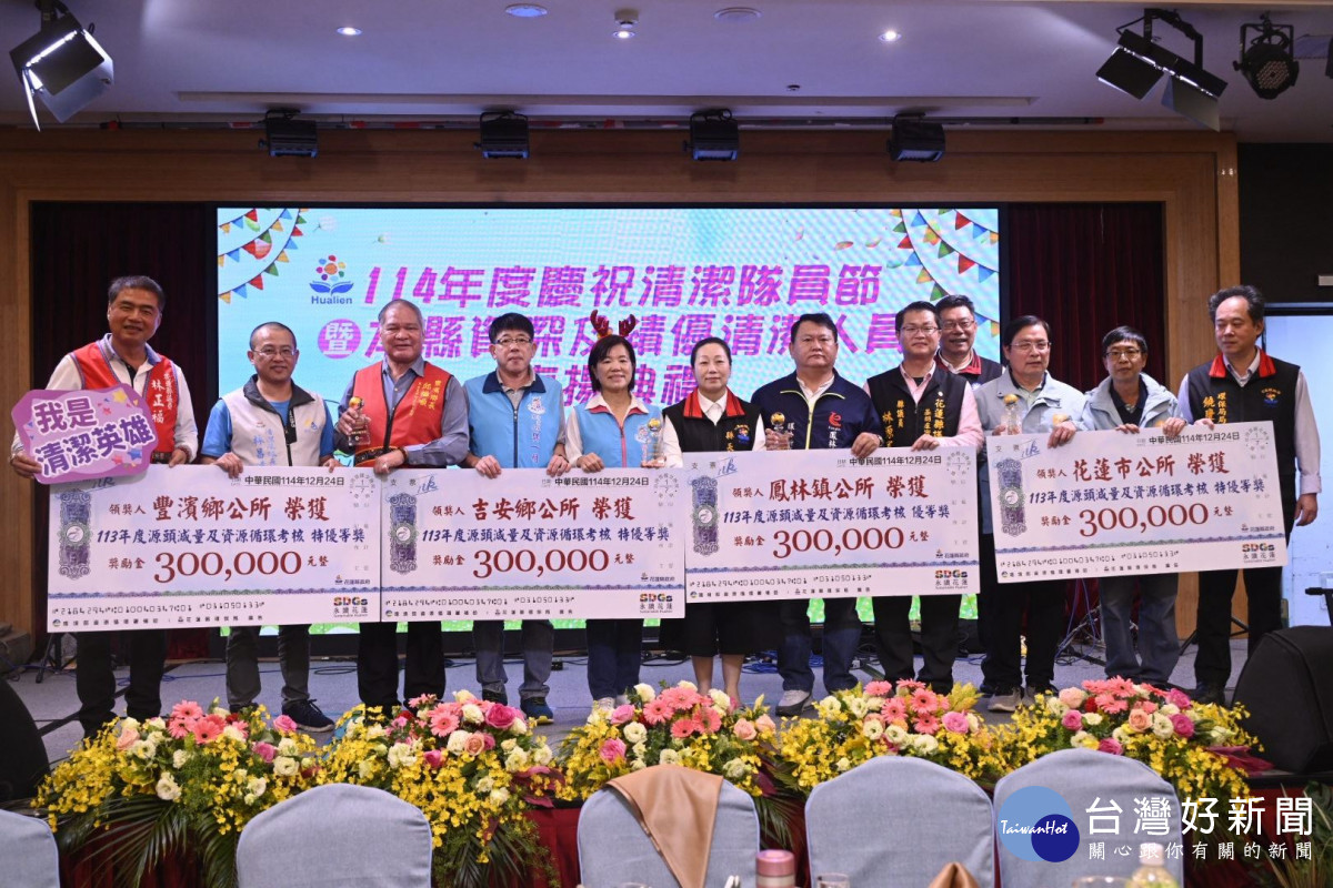典禮上徐縣長親自頒發「113年度執行機關加強資源回收工作績效考核績優獎」,表揚花蓮市、吉安鄉、豐濱鄉、鳳林鎮等4個公所,各獲頒獎金新台幣30萬元;另頒發「113年度花蓮縣環境清潔競賽實施計畫」績優公所獎項,甲組由花蓮市榮獲第一名、吉安鄉第二名、鳳林鎮第三名;乙組則由豐濱鄉獲得第一名、富里鄉第二名、萬榮鄉第三名。同時也表揚114年度獲選績優清潔人員22名及資深清潔人員81名,肯定其長期堅守崗位、敬業奉獻的精神。