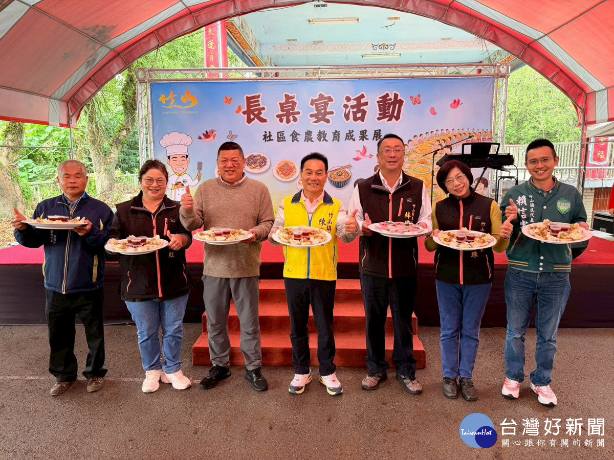 一道一道的美食由不同社區婦女精心製作手路菜端出來,令所有在場民眾都驚艷不已。南投縣竹山鎮公所28日首度在中央社區發展協會廣場舉辦「食農教育成果展暨長桌宴」,由鎮內多個社區與在地農友共同端出最道地的手路菜,以長桌宴形式展現推動食農教育的豐碩成果,現場結合社區展演及樂團演奏,吸引眾多社區夥伴踴躍參與,大家享受有如年終圍爐般的溫馨與熱鬧。