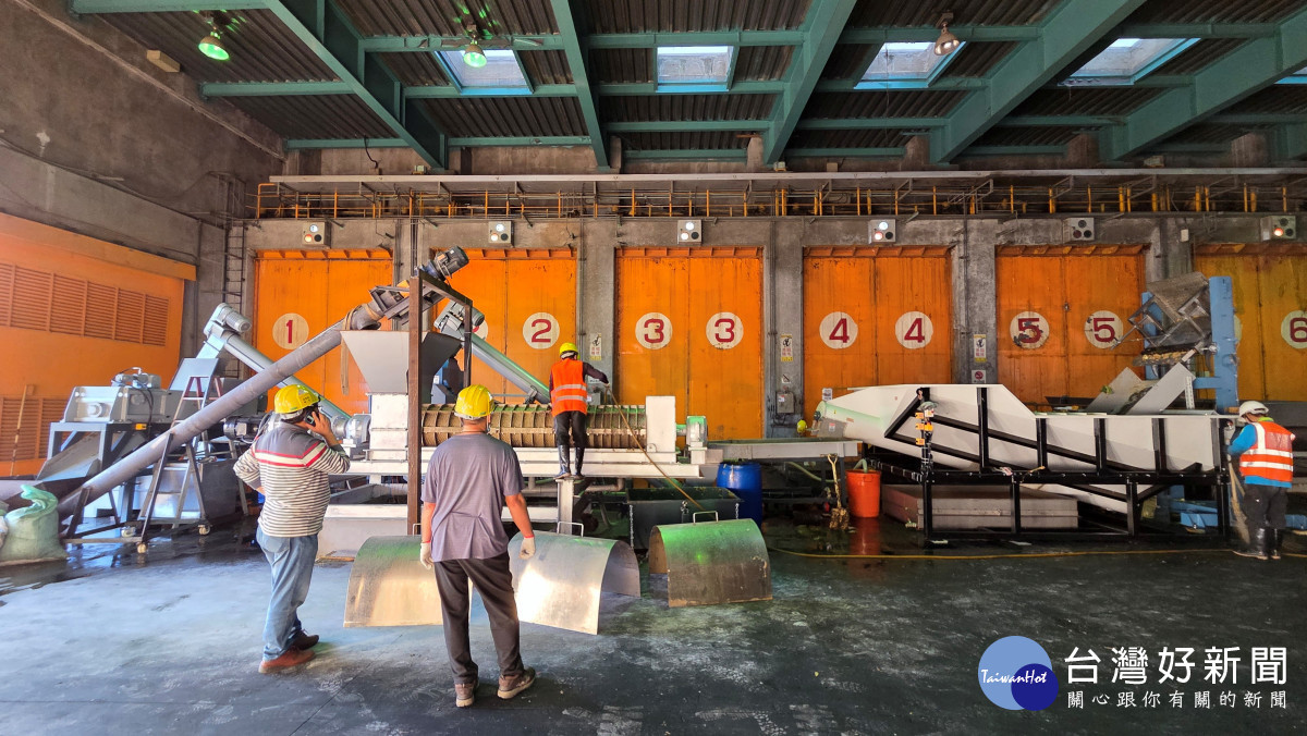 環保局說明,該套設備於前端採用翻桶裝置,輔助廚餘進料作業,降低人工搬運負擔;廚餘進料後透過人工分選篩出金屬或大團硬塊等不適合破碎物質,再進入破碎及擠壓脫水程序,平均去除約30%至40%的水分,每小時最大處理量約為8公噸熟廚餘,單日最大處理量可達60公噸。