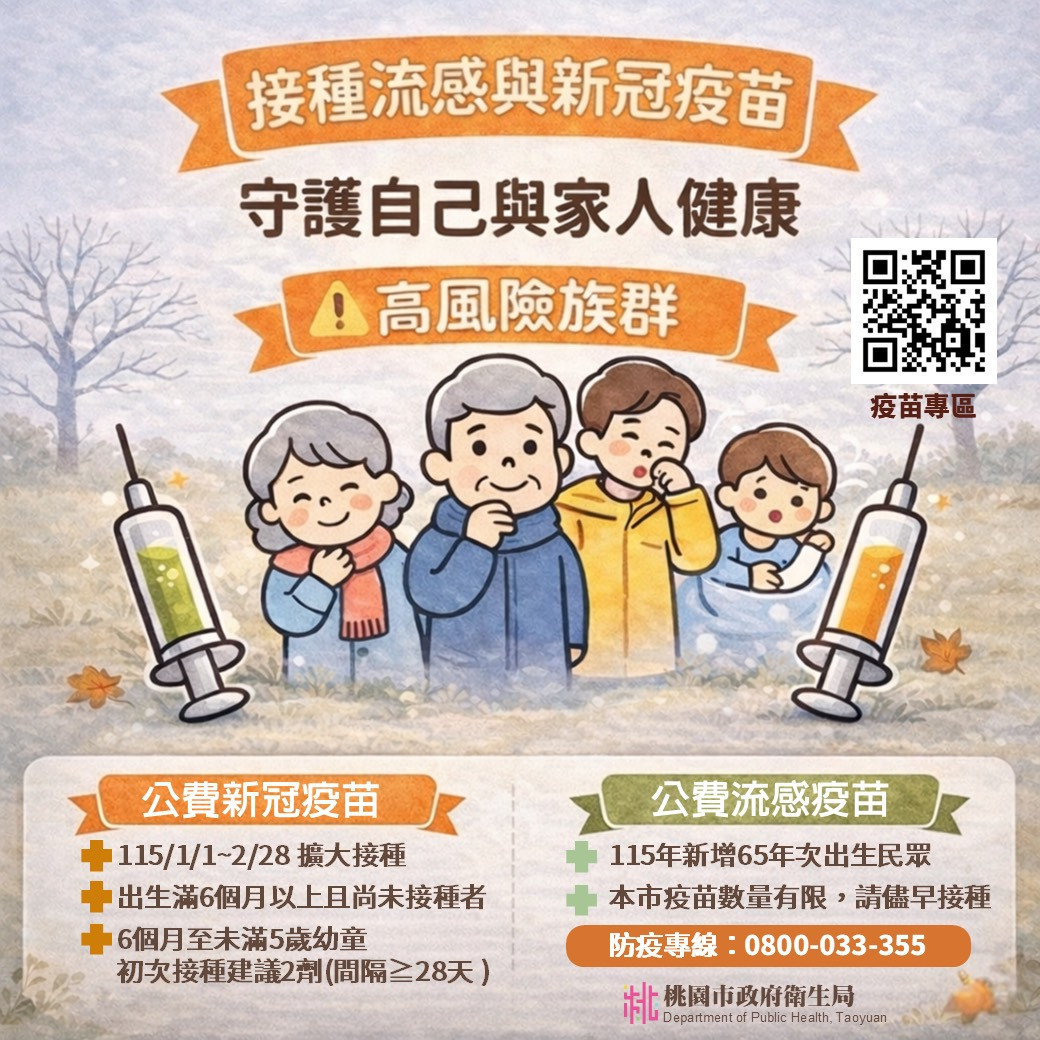 隨著春節連假即將到來,民眾返鄉及出國旅遊人潮頻繁,加上入冬首波寒流來襲,國際疫情持續攀升,呼吸道傳染病傳播風險明顯升高。衛生局提醒,接種疫苗是守護自己與家人健康最有效的預防方式,目前桃園市公費流感疫苗庫存約剩1.9萬劑,另公費新冠疫苗自115年1月至2月擴大接種對象,符合接種資格民眾請及早接種,尤其高風險族群更應儘速完成疫苗接種。