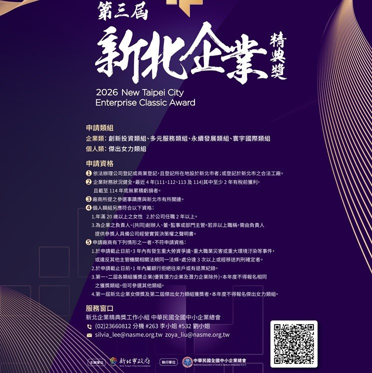 為協助企業更有方向地準備參選資料,市府將於1月16日(五)辦理首場徵件說明會(報名網址:https://www.surveycake.com/s/mpMmx),完整說明評選指標、系統操作及獲獎效益,並邀請第二屆獲獎企業「德淵企業股份有限公司」,分享參賽準備過程與獲獎後的寶貴經驗。會後亦提供個案諮詢服務,協助企業完善申請內容,符合資格的企業要把握機會踴躍報名。相關報名資訊與申請方式,請至第三屆新北企業精典獎官方網站(https://ntceca.esc.org.tw/)查詢,或洽新北企業精典獎工作小組(02-23660812 分機263、532)。