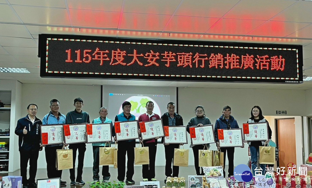 大安區農會舉辦「115 年度大安芋頭行銷推廣活動」,大安區長許綺優質芋頭栽培的績優農友頒獎表揚。(記者陳榮昌攝)