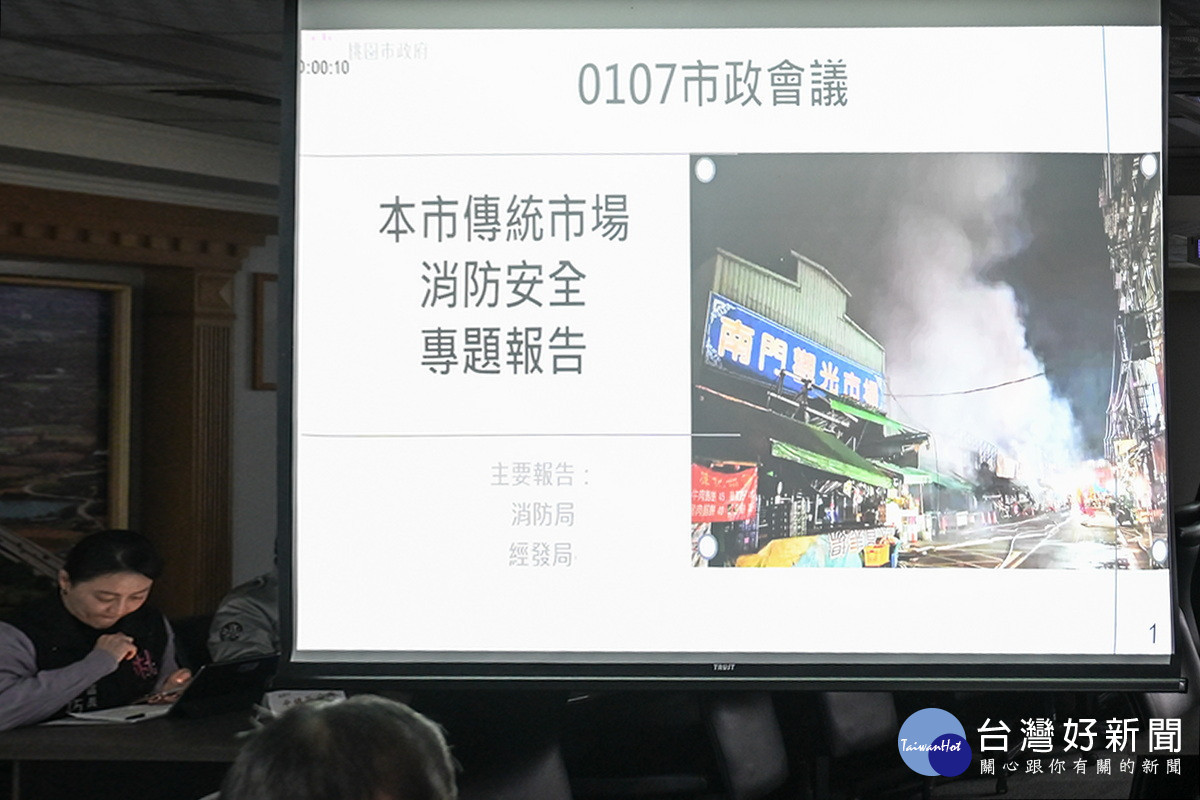 桃園市政府市政會議中進行「桃園市傳統市場消防安全」專題報告。<br />