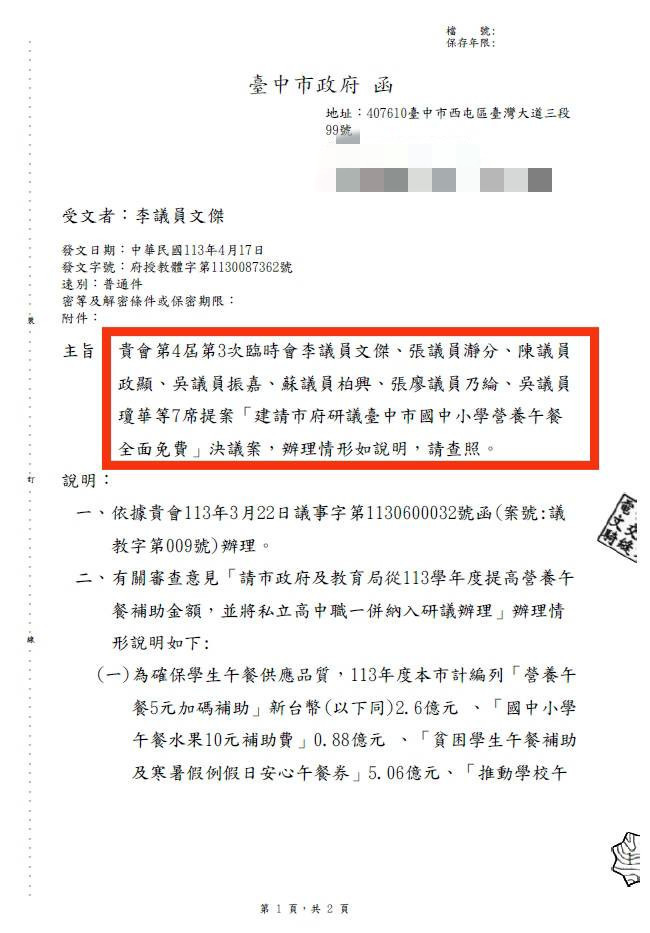 市議員李文傑、張瀞分、張廖乃綸、陳政顯、吳振嘉、蘇柏興、吳瓊華等人113年即在市議會臨時會具體提案,建請台中市政府研議台中市國中小學營養午餐全面免費。市議員張廖乃綸表示,過去議員們在議會中長期監督學童營養午餐的品質及安全問題,也不斷要求市府要加碼補助學童營養午餐,減輕家長育兒負擔。午餐吃的營養又健康,快樂學習成長,感謝盧秀燕市長聽到民意需求,讓孩子吃得安心,也減輕家長的負擔。