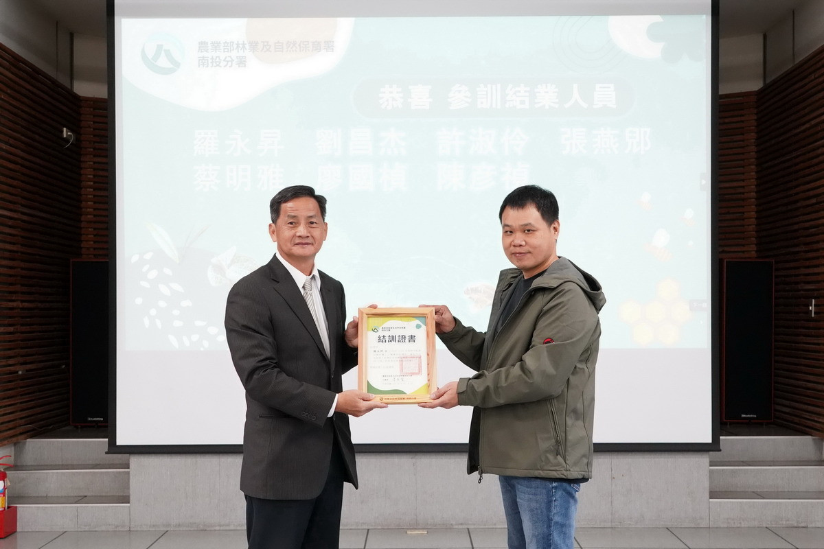 林保署南投分署分署長李政賢(左)頒發結業證書給學員羅永昇(右)。(林保署南投分署提供)