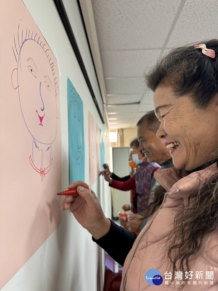 課程中安排穴道按摩與上肢伸展運動,並透過按摩球進行實作,讓長輩在動中覺察身體、放鬆身心;暖身活動以「世界上沒有一模一樣的存在」引導學員思考自我獨特性,主題活動則鼓勵學員分組創作專屬於自己的圖像作品,展現豐富想像力與生命故事。同時也融入心理健康小知識,協助長輩理解自我價值對心理健康的重要性。