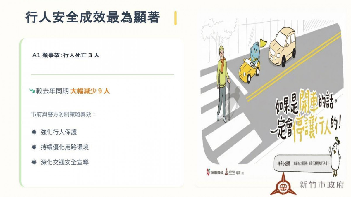 警察局長許頌嘉表示,市府在建構安全行人環境上已見成效,整體事故發生頻率與傷害程度呈現同步下降趨勢。尤其在行人安全方面,A1類交通事故中行人死亡人數較去年同期大幅減少9人,成果尤為顯著,展現市府近年持續強化行人保護、優化用路環境及深化交通安全宣導的成果。