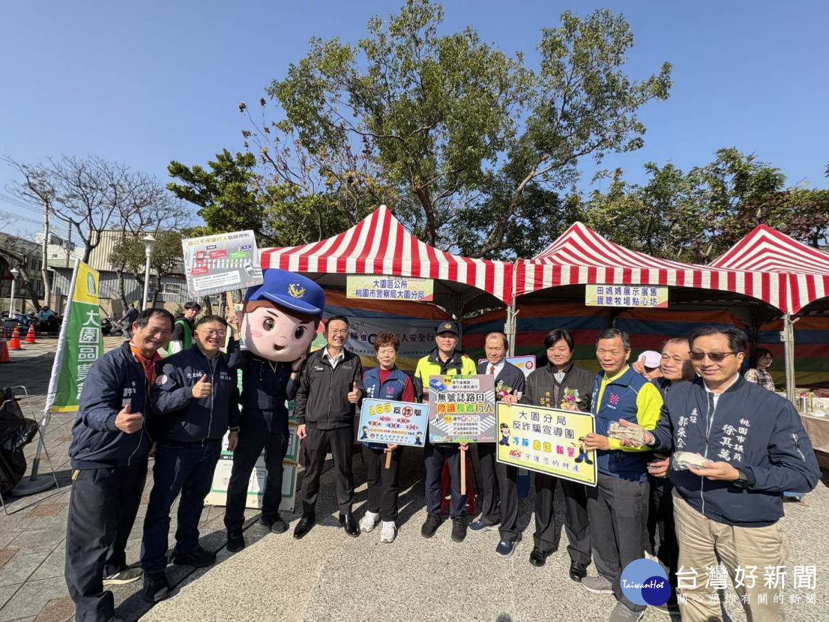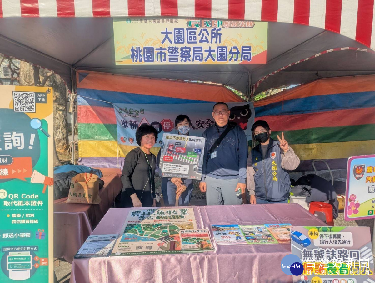 近期冷氣團來襲氣溫驟降,不少民眾會食用含有酒精成分的補品來禦寒,大園警分局為此特別於13日結合115年大園區農民節慶祝活動,於現場設攤宣導交通安全及反詐騙,提醒民眾切勿酒後開車,並以有獎徵答方式加深民眾的印象,面對層出不窮的詐騙手法,應提高自我防詐意識。