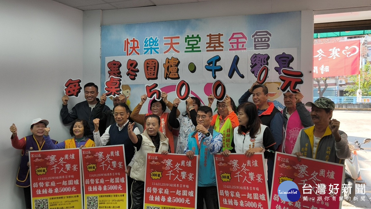為關懷弱勢族群、傳遞社會溫暖,快樂天堂基金會於民國今年1月25日,在彰化縣社頭果菜市場隆重舉辦第十二屆「寒冬圍爐,千人饗宴」公益活動,邀請彰化縣低收入戶、貧困獨居老人、街友及邊緣戶,社會機構共襄盛舉,預計現場席開300桌,招待約3,000位弱勢朋友,一同圍爐迎新年。