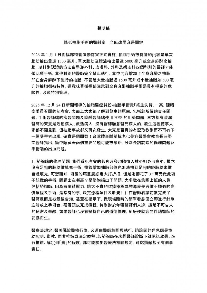 他呼籲,醫美產業應回歸醫療本質,從諮詢制度、麻醉選擇到手術安全全面檢視,才能真正降低醫療糾紛,保障民眾健康與醫師專業尊嚴。