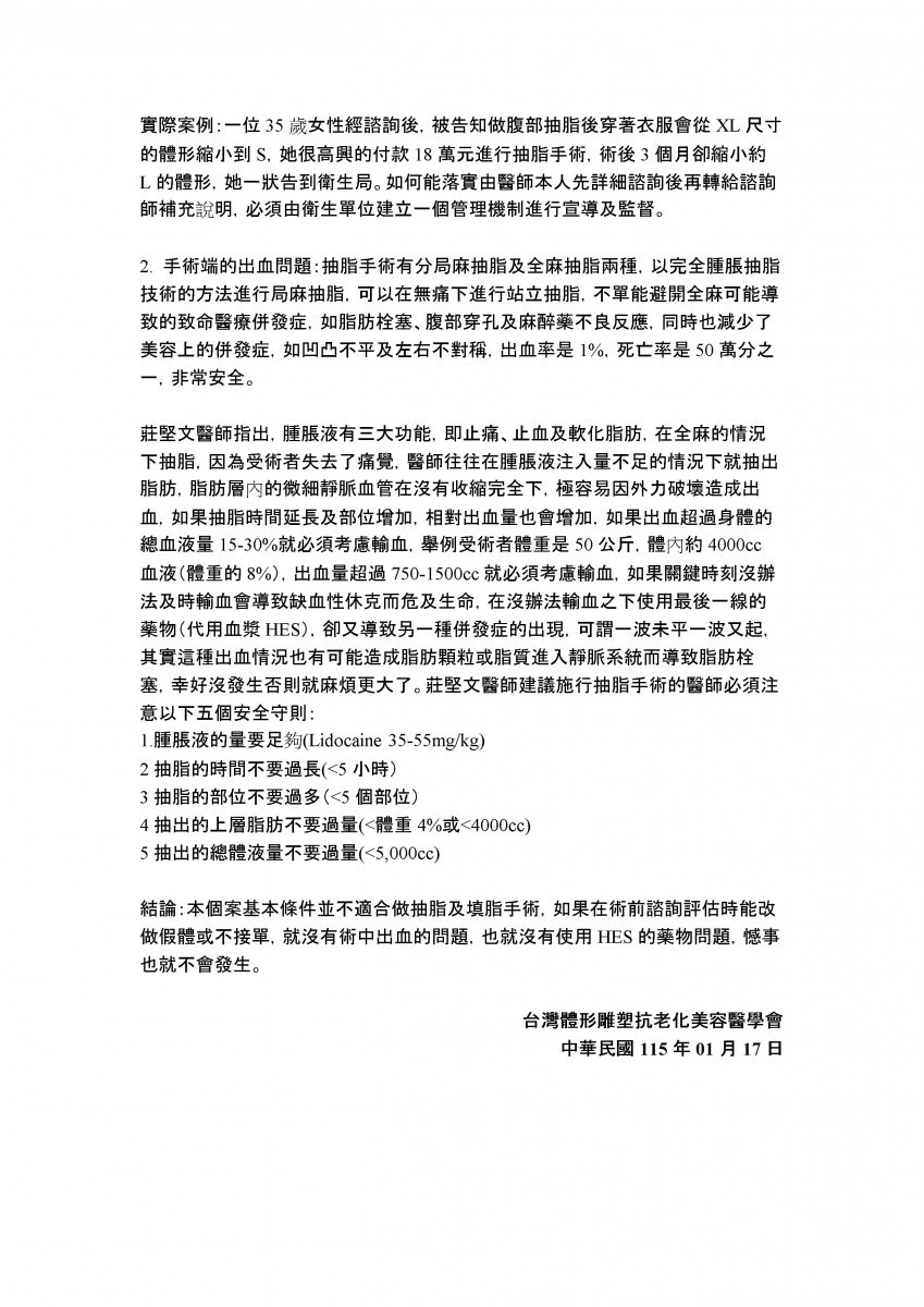 隨著醫美療程普及,抽脂手術相關醫療糾紛屢次躍上新聞版面。對此,台灣體形雕塑抗老化美容醫學會教育長莊堅文醫師指出,近期多起爭議案例顯示,問題不僅在於技術本身,更涉及諮詢端的醫療倫理失守與全身麻醉抽脂潛藏的高度風險,值得社會與主管機關正視。