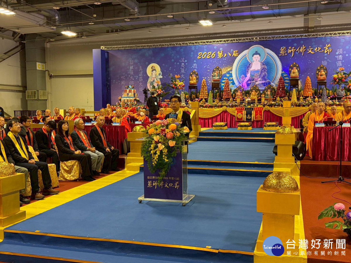 新北市政府與慈法禪寺共同主辦「2026年第八屆藥師佛文化節」,今(18)日持續於圓山花博爭豔館展開,透過藥師法門修持、佛前獻供、供燈祈願及多元文化展演,引領大眾安定身心、齊修善念,為全球祈福,願眾生安樂。副秘書長柯慶忠及民政局長林耀長也出席獻供,共同感念藥師琉璃光如來「拔苦與樂、護念眾生」的宏願精神。