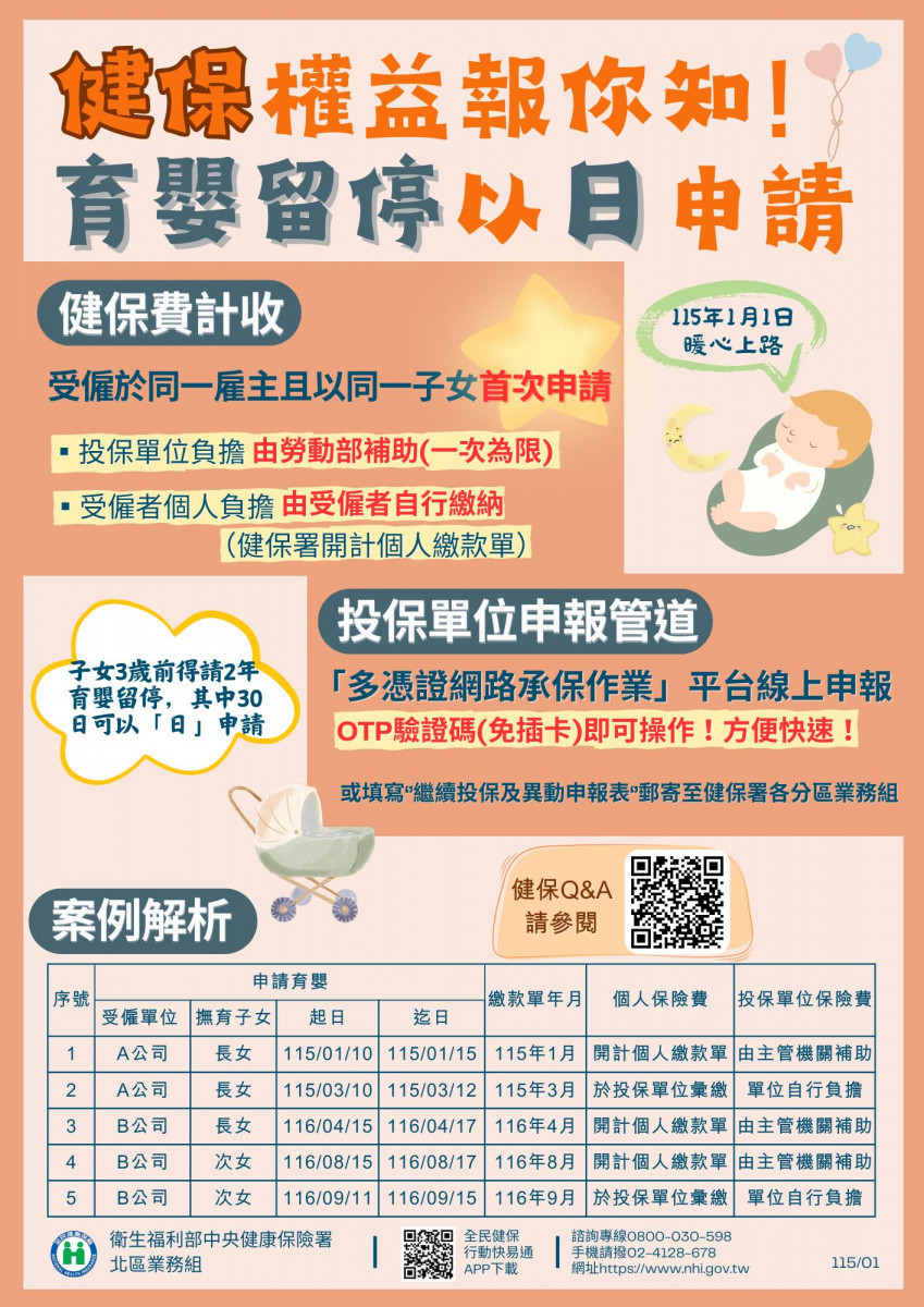 以「日」申請育嬰假 健保署提醒同時辦理健保申報