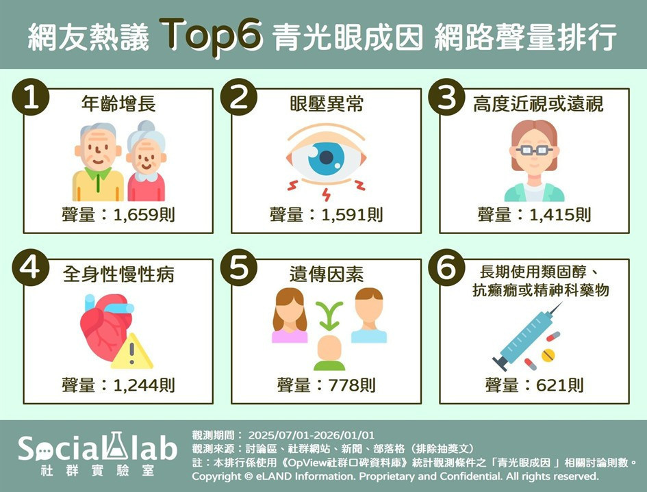 青光眼因早期症狀不明顯,常被稱為「視力的無聲殺手」。許多人誤以為這是長輩專屬的疾病,但數據顯示患者已出現年輕化趨勢。《Social Lab 社群實驗室》透過《OpView 社群口碑資料庫》追蹤近六個月數據,揭曉「六大青光眼成因」聲量排行榜。除了年齡增長眼壓異常高度近視更是網友熱議的關鍵因子。醫師提醒,視野缺損往往不可逆,定期檢查才是保住視力的唯一途徑。